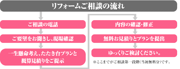 ※全面改装等の大型工事や新築は上記の契約確認時にプラン契約をさせていただきます。その後の詳細プラン内容のうち合わせは費用がかかります