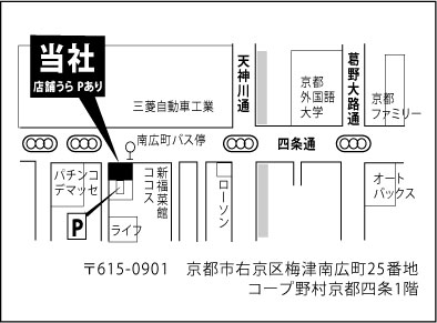 | 住所 | 〒615-0901 京都市右京区梅津南広町25番地 コープ野村京都四条1階 |