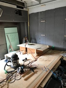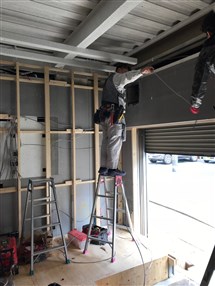 シャッターを撤去し、外壁とサッシを作り、玄関廻りを作ります