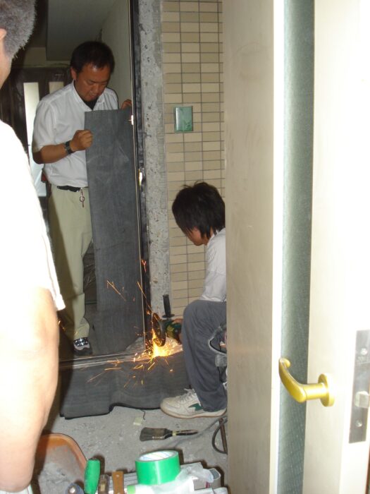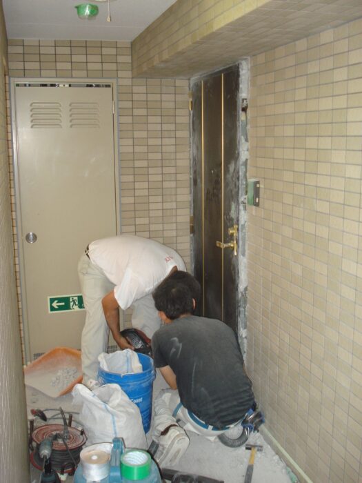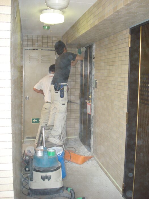 既存のドアの周りのコンクリートをはつって、ドアの枠を露出させます。