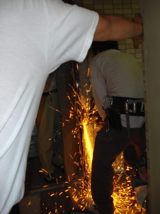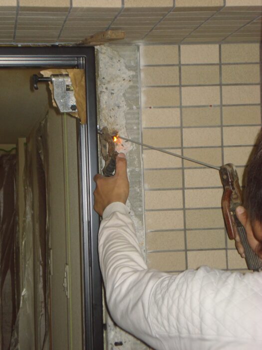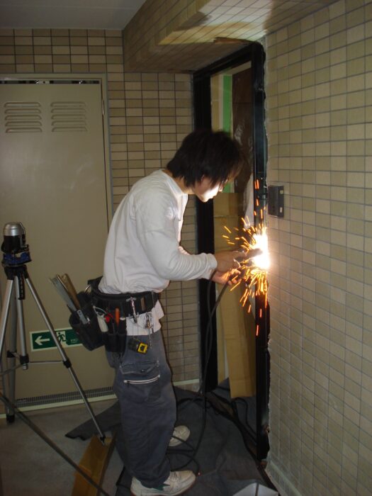 新しいドアの枠を、溶接で取り付けます。その後ドア本体を取り付けます。