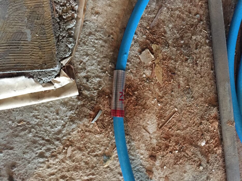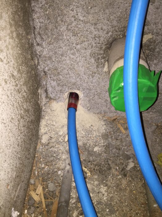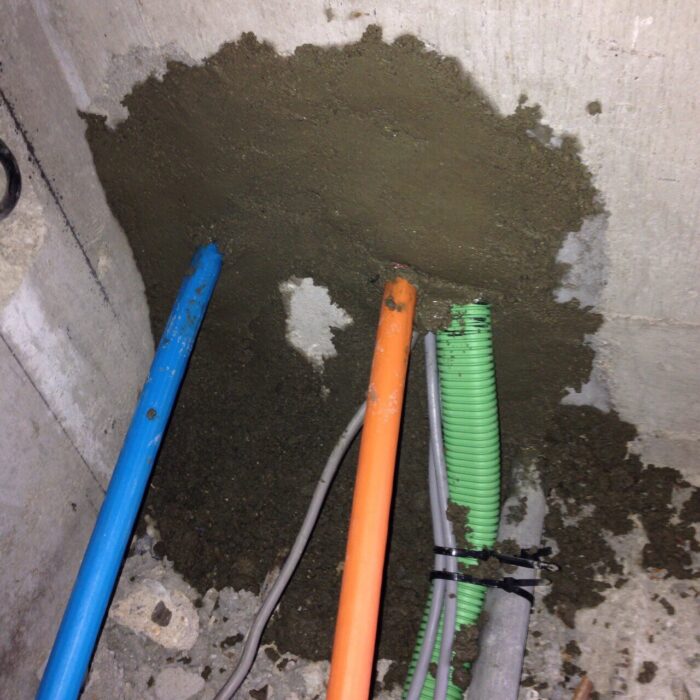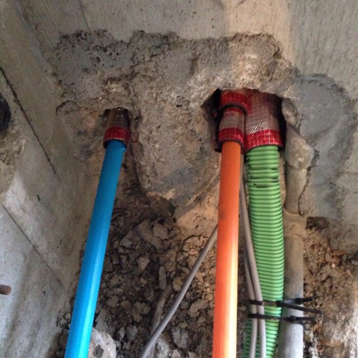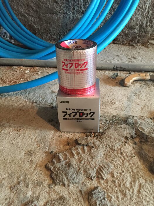 躯体に配管を通す貫通部分は、火災時の為に貫通孔に特殊なテープを巻き、穴をモルタル等で塞いでください。