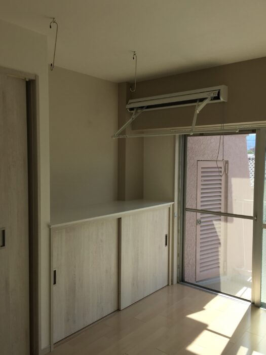 さらに、ちょっとした時にかけられる収納式の室内物干しを設置しています。