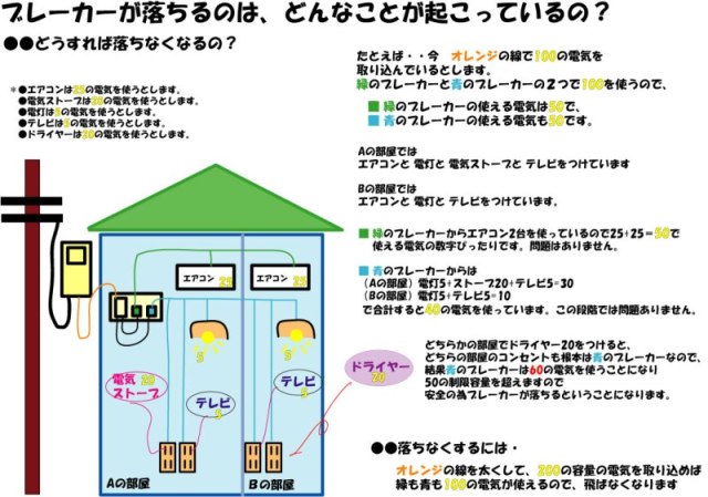 総合TOP レナトスグループ建築部 ブレーカーが落ちる原因 ブレーカーが落ちる原因 00/02/11 ブレーカーが落ちるのは「電気の使いすぎ」なのですが、使い過ぎといっても、古い家の場合は「来ている電気の容量が、そもそも小さく作ってあり」それに対して使い過ぎなので、決して贅沢をしている事ではありません。昔と今ではエアコンなどの電化製品が増えて、基本的需要が増えています。基本的な分で増えているので、少し使うとブレーカーが落ちます。 昔のままの容量で作ってある家は容量を増やせば問題解決です。 「ブレーカーが落ちる」の原因について、イラストで説明してみました。わかりにくいかな・・。。 < 前の記事へ 次の記事へ > 一覧へもどる >>
